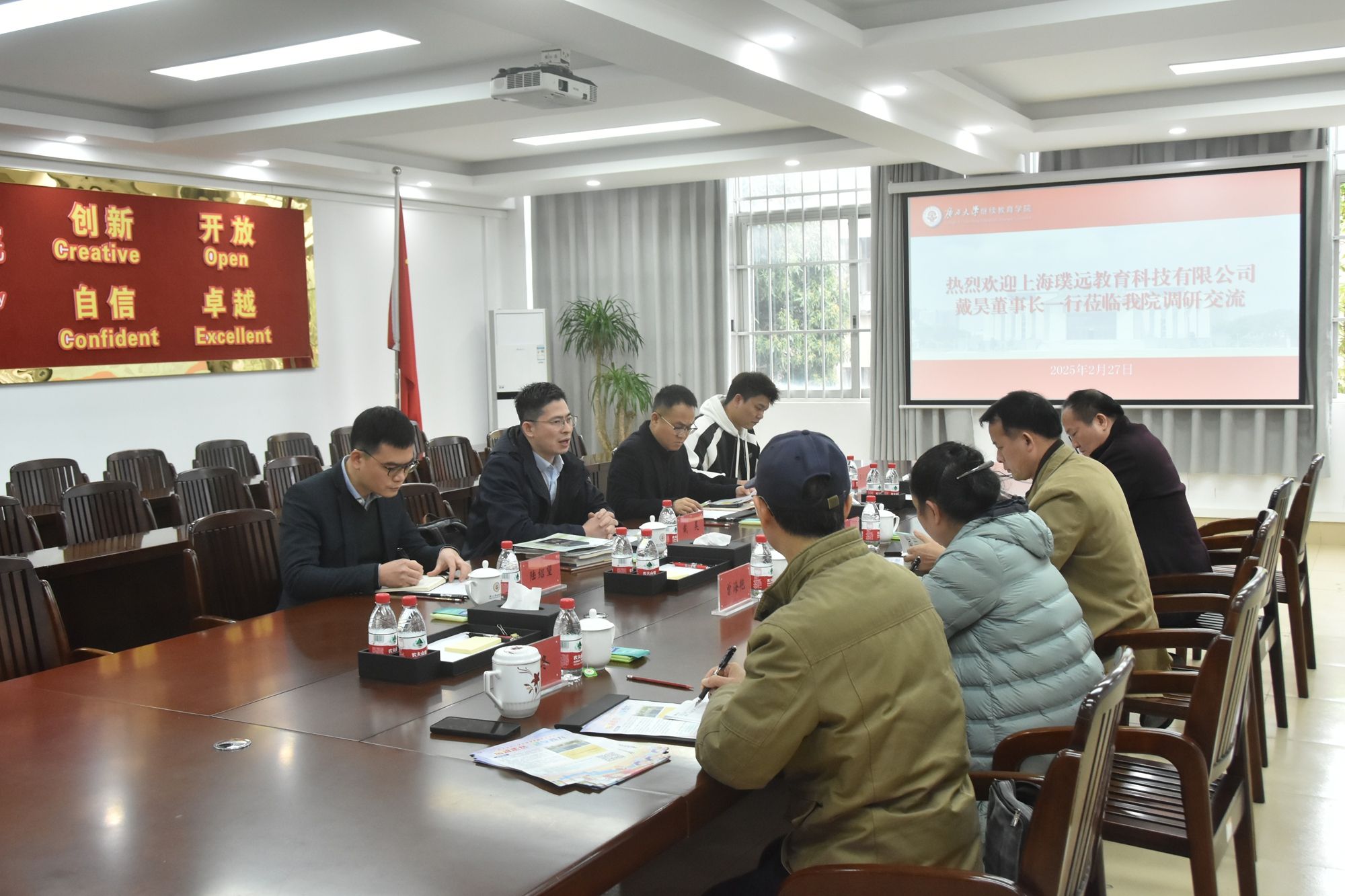 2025年2月27日下午,九游首页与上海璞远教育科技有限公司在学院会议室进行研学工作会谈。继续教育学院院长闭富春、副院长曾海艳、上海璞远教育科技有限公司董事长戴昊、董事莫烦等出席了会议。
