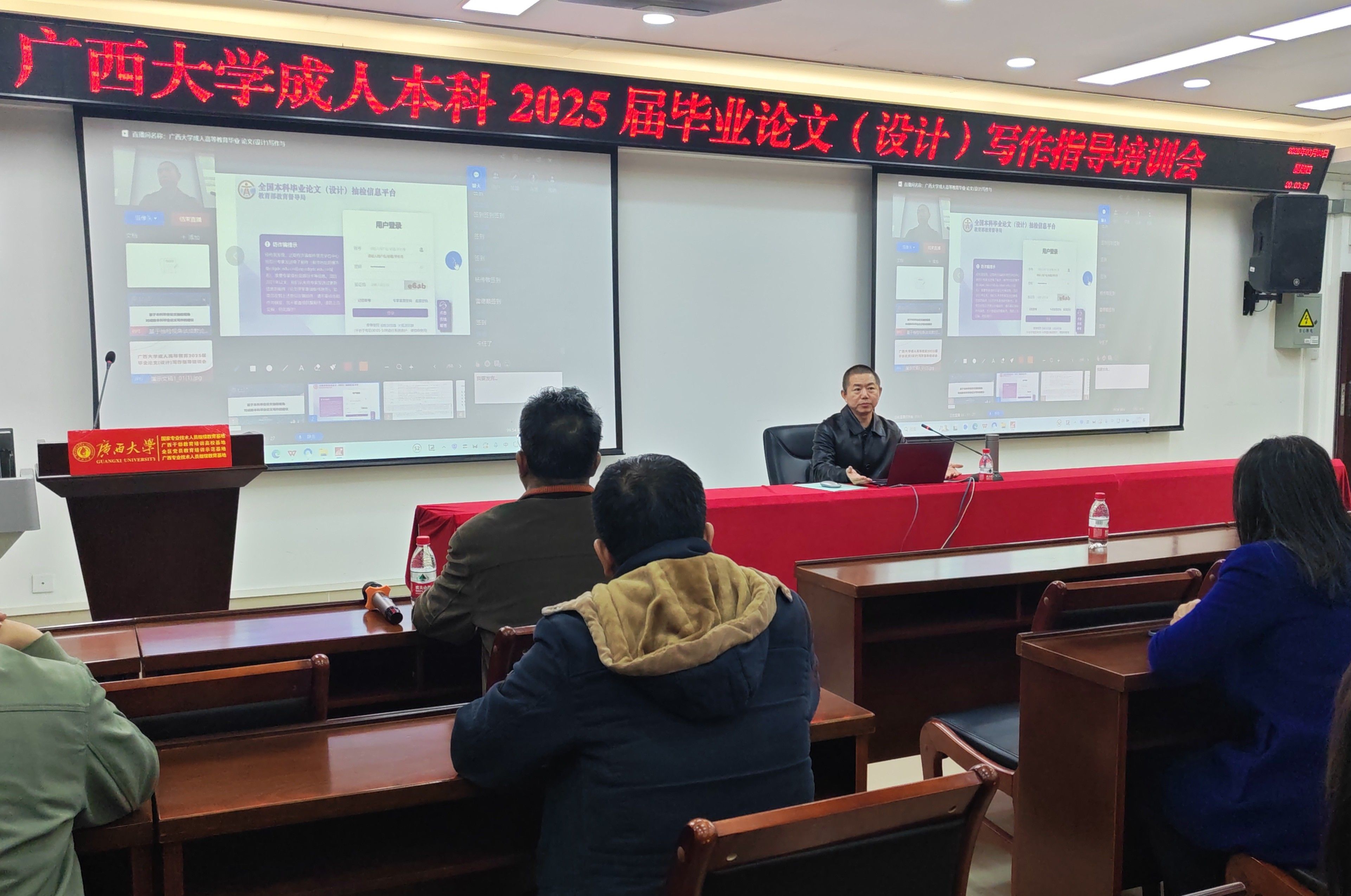 为强化我校成人本科毕业论文(设计)写作规范,提升学生毕业论文(设计)写作水平,九游首页于2025年3月6日晚举办了2025届成人本科毕业论文(设计)写作指导培训会。培训会由继续教育学院副院长谭鸿禹主持,我校教育教学质量监控与评价中心副主任、教学督导团副团长王恩界教授主讲,培训采用线下与线上同步直播相结合的形式举行,1200余名2025届成人本科毕业生参加了培训。