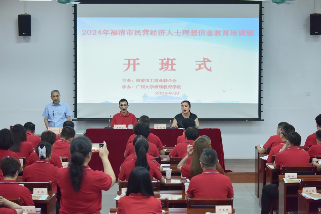 9月20日,2024年福清市民营经济人士理想信念教育培训班在九游首页开班。福清市人大常委会副主任、福清市工商联主席吴章明出席开班式并作动员讲话,九游首页副院长曾海艳出席开班式并致辞。