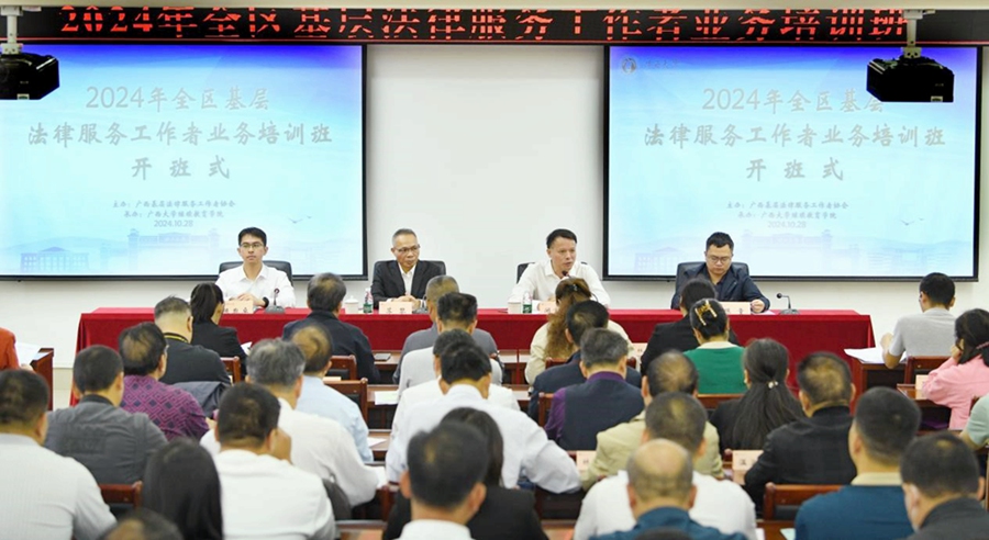 10月28日,2024年全区基层法律服务工作者业务培训班在九游首页开班。广西基层法律服务工作者协会会长苏黎、自治区司法厅律师工作处副处长、广西基层法律服务工作者协会秘书长陈童出席开班式,九游首页院长闭富春出席开班式并致辞。