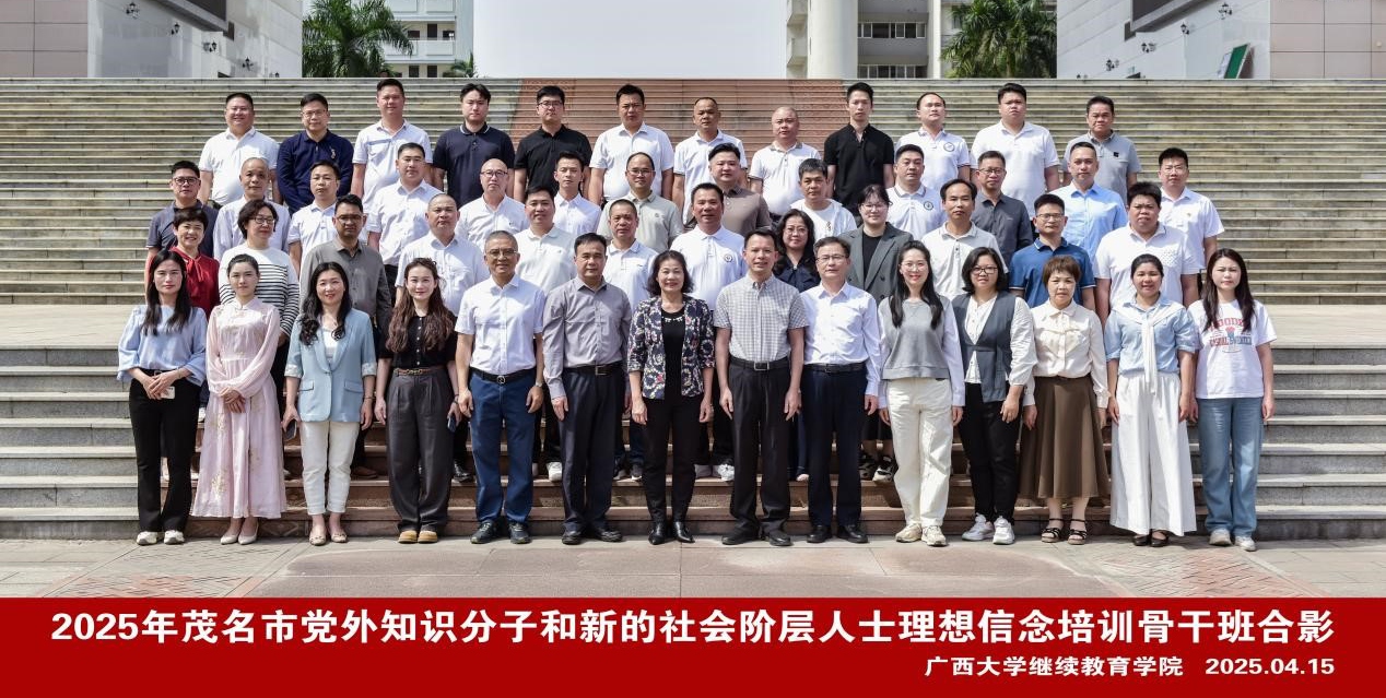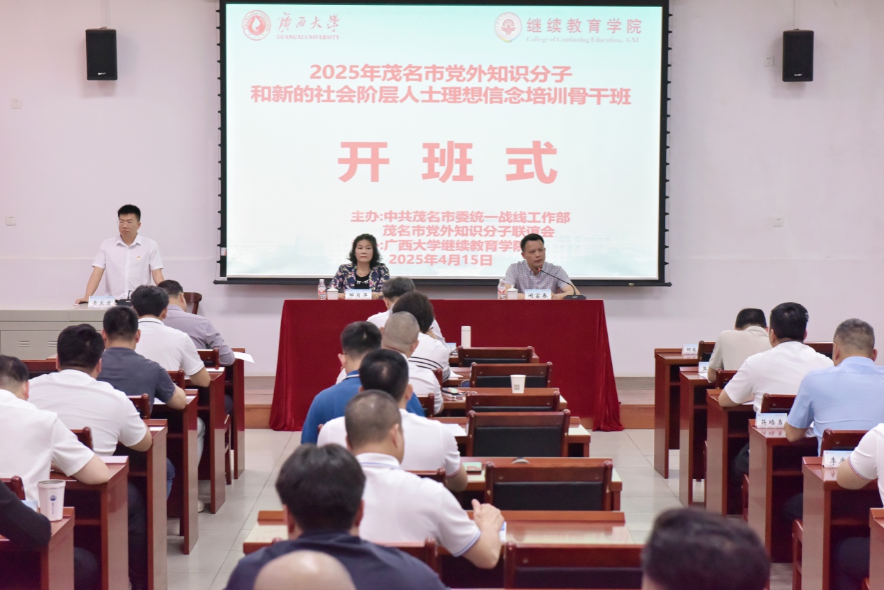 2025年4月15日,2025年茂名市党外知识分子和新的社会阶层人士理想信念培训骨干班在我校开班,茂名市委统战部二级调研员邹肖萍、九游九游(中国)院长闭富春出席开班式。
