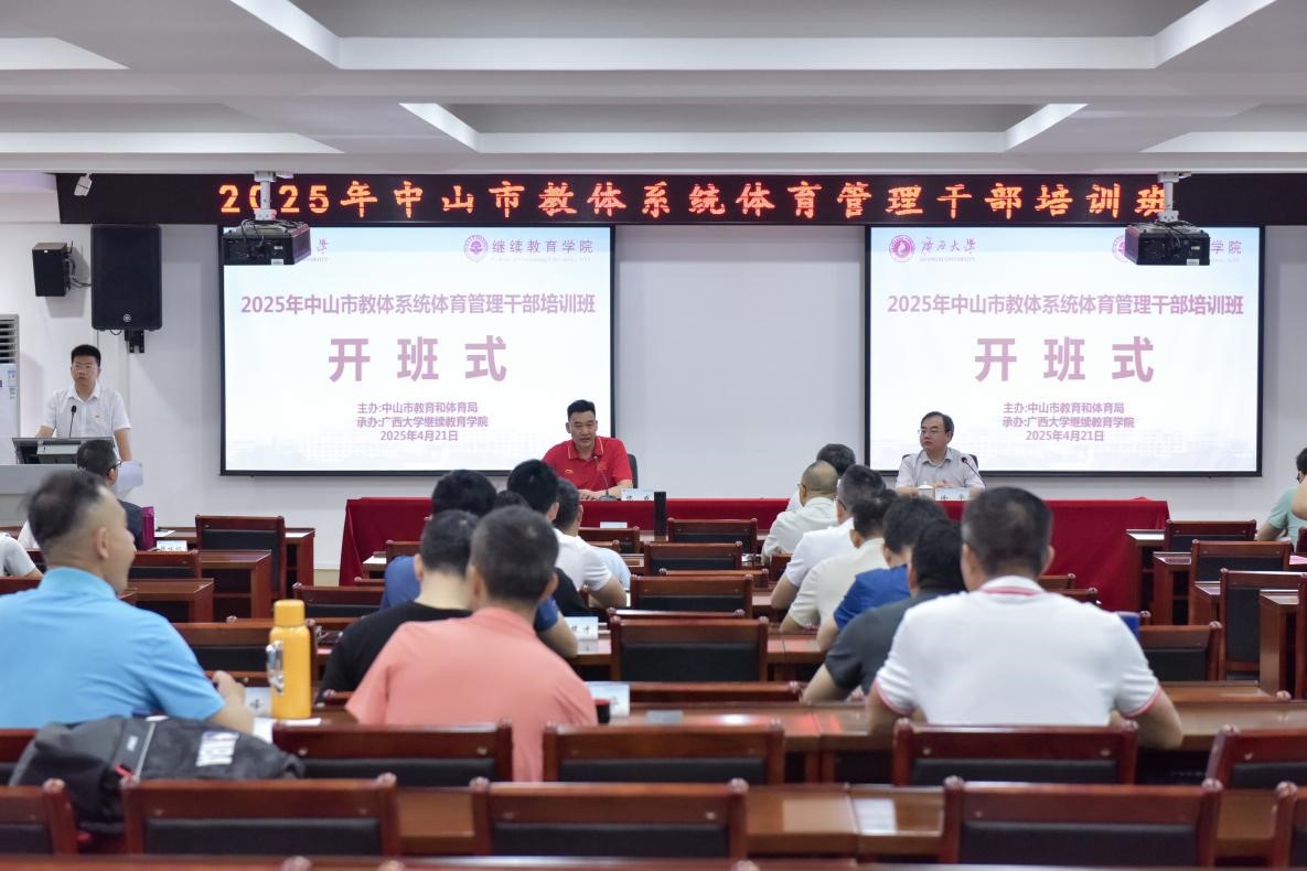 2025年4月21日,2025年中山市教体系统体育管理干部培训班在我校开班。中山市教育和体育局副局长陈威、九游九游(中国)副院长徐华出席开班式。