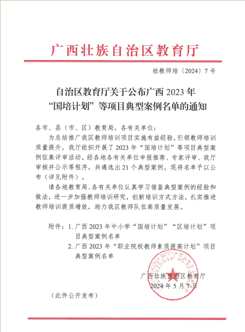 凭借这些优势,学院在国培计划项目中成果丰硕。2024年,学院组织策划了多个国培项目,涵盖初中党组织书记、农村骨干教师等多个领域。值得一提的是,2023年策划实施的“初中党组织书记研修”项目中的“引入影子书记,助力领导力蜕变”跟岗研修案例,荣获2024年广西壮族自治区教育厅中小学“国培计划”“区培计划”项目典型案例奖项,这一荣誉彰显了学院在培训创新和质量提升方面的实力。