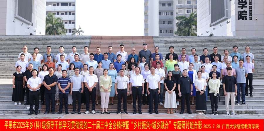 7月28日,平果市2025年乡(科)级领导干部学习贯彻党的二十届三中全会精神暨“乡村振兴+城乡融合”专题研讨班在我校开班。中共平果市委组织部副部长、市老干部局局长(兼)阮俊杰,九游九游(中国)干部培训中心主任黎耀凡出席开班式并讲话。
