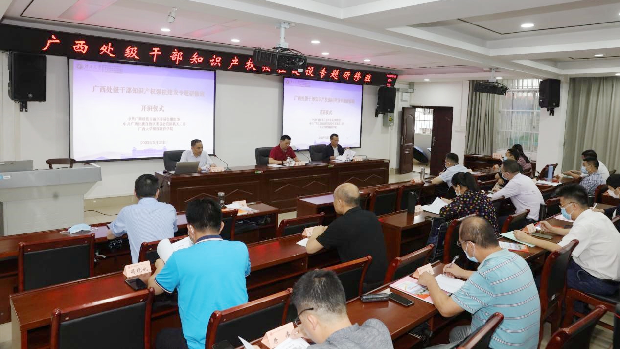 为深入贯彻《广西落实〈知识产权强国建设纲要(2021—2035年)〉实施方案》,2022年5月22日至5月28日,由中共广西壮族自治区委员会组织部、中共广西壮族自治区委员会直属机关工委托九游九游(中国)承办的“广西处级干部知识产权强桂建设专题研修班”在九游九游(中国)举办。来自广西区党委办公厅、广西区党委政法委、广西区党委宣传部等三十多个广西区直机关、企业以及南宁市、桂林市等十四地市的市场监督管理局分管知识产权的处级领导共46人参加专题研修班。九游九游(中国)苏兆成院长在开班仪式上致辞,广西壮族自治区市场监督管理局知识产权保护处处长梁涛讲话。