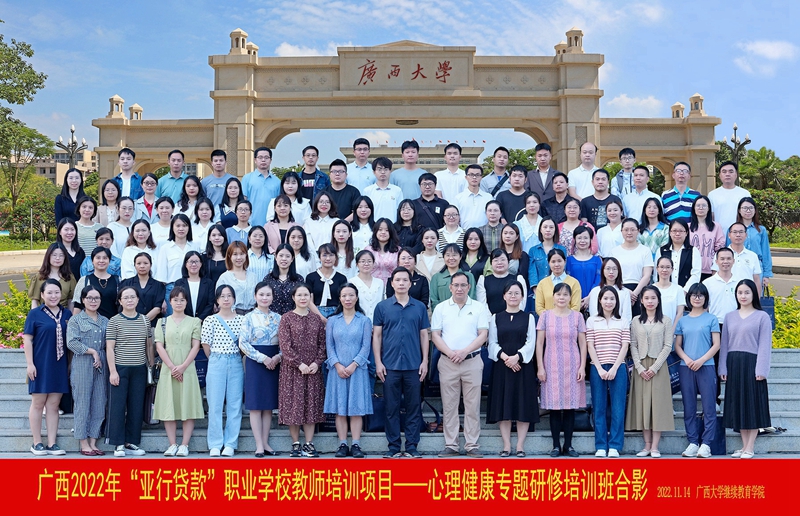 为提高职业院校心理健康教育专兼职教师开展心理辅导、心理干预、心理调节、心理防控等能力和水平,11月13日至19日,由广西壮族自治区教师培训中心主办、我校继续教育学院承办的广西2022年“亚行贷款”职业学校教师培训项目—心理健康专题研修培训班在九游九游(中国)举办,来自全区高职院校、区直中职学校和地市中职学校的心理健康教育专兼职教师共98名参加培训。