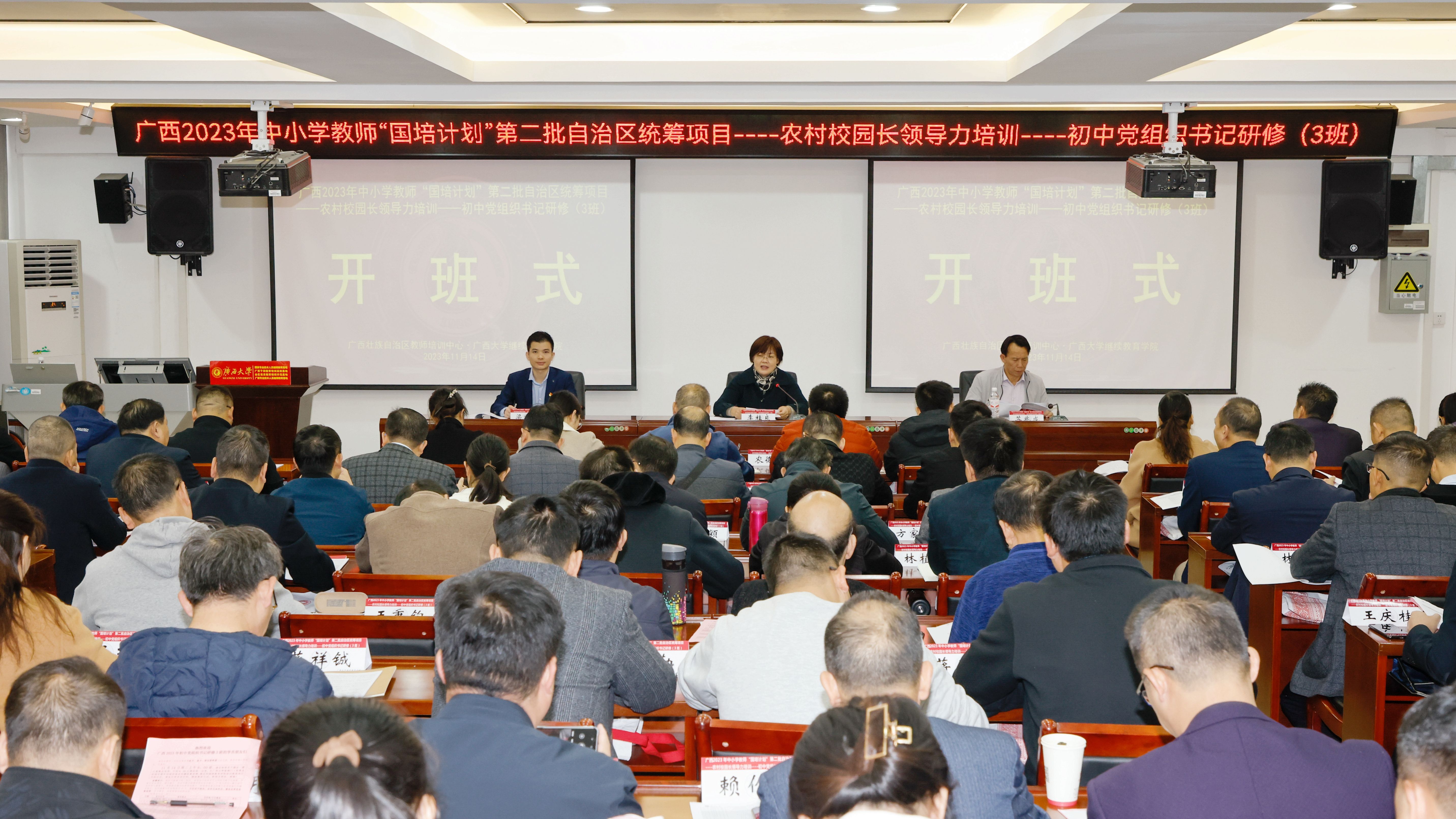 11月14日上午,由广西壮族自治区教师培训中心主办,九游九游(中国)承办的“广西2023年农村校园长领导力培训——中小学党组织书记研修(初中党组织书记3班)”开班仪式在我校举行。广西壮族自治区教师培训中心主任李桂良、九游九游(中国)院长苏兆成出席仪式,来自广西14个市的110名中学党组织书记、党务骨干参加仪式。