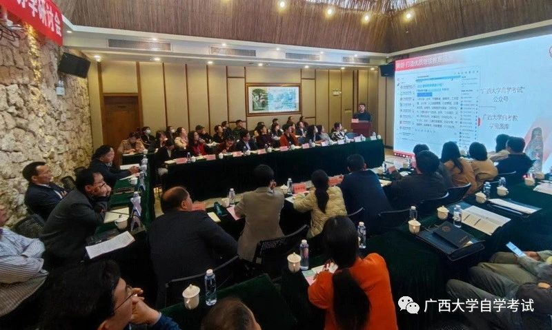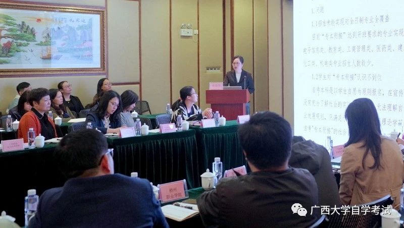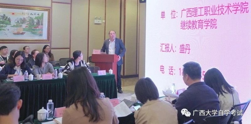 广西工业职业技术学院继续教育学院曾伟坚院长、广西理工职业技术学院继续教育学院盛丹院长分别介绍了各自学校的办学情况及管理机制。北京正保自考365网校营销总裁邵剑英就自考网络助学平台作了介绍。